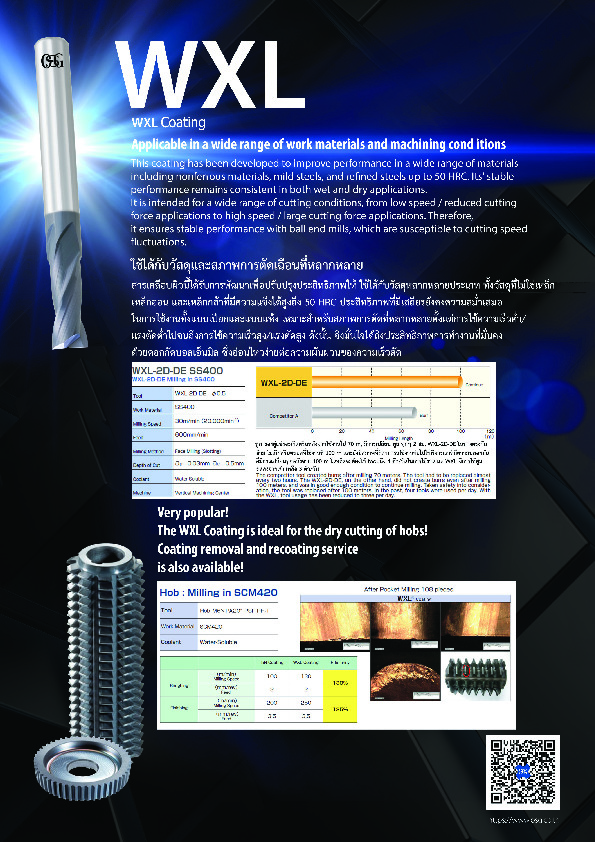 WXL Coating เป็นเทคโนโลยีการเคลือบประสิทธิภาพสูงที่จัดทำโดย OSG การเคลือบนี้สามารถใช้งานได้กับวัสดุหลากหลายชนิด โดยเฉพาะวัสดุที่ไม่ใช่เหล็ก เหล็กอ่อน และเหล็กที่มีความแข็งถึง 50HRC การเคลือบนี้รักษาประสิทธิภาพที่เสถียรทั้งในสภาวะการตัดแบบเปียกและแห้ง และสามารถรองรับการตัดที่มีความเร็วตั้งแต่ต่ำไปจนถึงสูง ทำให้ WXL Coating เหมาะสมกับงานตัดด้วยดอกเอ็นมิล (Ball End Mill) หลากหลายประเภท มอบความเสถียรและประสิทธิภาพสูงในการตัด