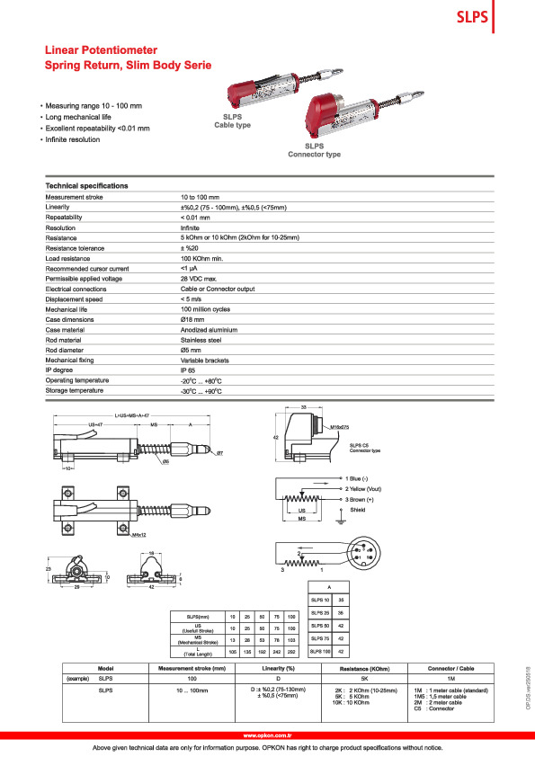 โพเทนชิโอมิเตอร์เชิงเส้น OPKON รุ่น SLPT พร้อมระบบสปริงคืนตัว, ซีรี่ส์ตัวเครื่องบาง