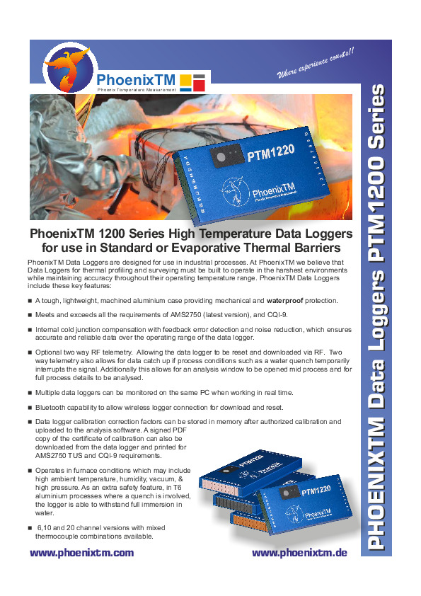 ซีรี่ย์ดาต้าล็อกเกอร์ PTM1200 ของ PhoenixTM เป็นผลิตภัณฑ์ที่ออกแบบมาเพื่อใช้งานในสภาพแวดล้อมที่มีอุณหภูมิสูงในกระบวนการอุตสาหกรรม โดยมีการใช้เคสอลูมิเนียมที่ทนทานและเบา สามารถทำงานได้อย่างแม่นยำแม้ในสภาพแวดล้อมที่เข้มงวดที่สุด ภาคภูมิใจในคุณภาพที่ไม่เพียงแต่ตอบสนองแต่ยังเกินกว่ามาตรฐาน AMS2750 และ CQI-9