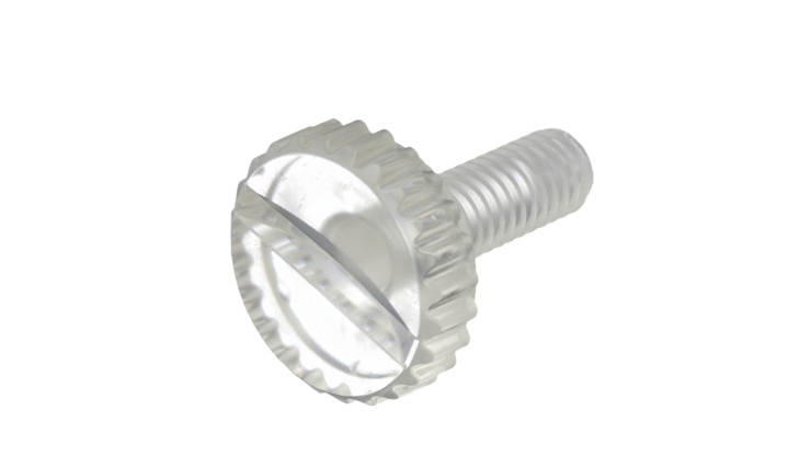 สกรูเรซินหัวร่องลบโปร่งใส ผลิตจากโพลีคาร์บอเนต แข็งแรง น้ำหนักเบา ทนความร้อน ไม่เป็นสื่อนำไฟฟ้า ขันมือได้ ไม่ต้องใช้เครื่องมือ