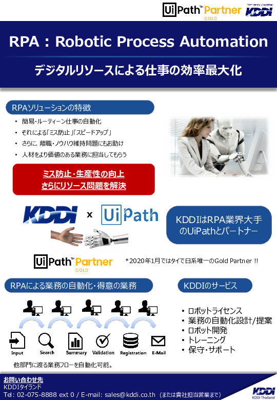 ในฐานะหุ้นส่วนระดับทองของ UiPath ซึ่งเป็นผู้เล่นหลักในอุตสาหกรรม RPA บริษัท ให้บริการทั้งหมดเช่นการระบุธุรกิจของลูกค้าข้อเสนอการออกแบบ / พัฒนาอัตโนมัติการฝึกอบรมและการบำรุงรักษา / การสนับสนุน